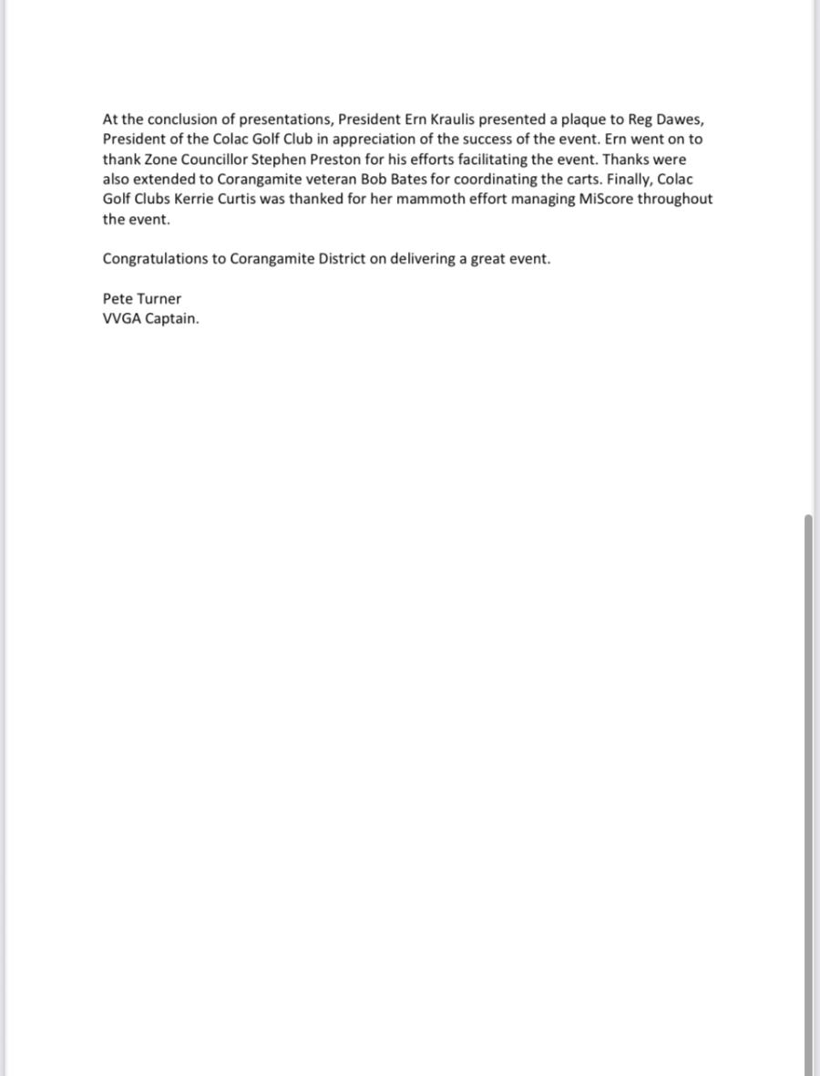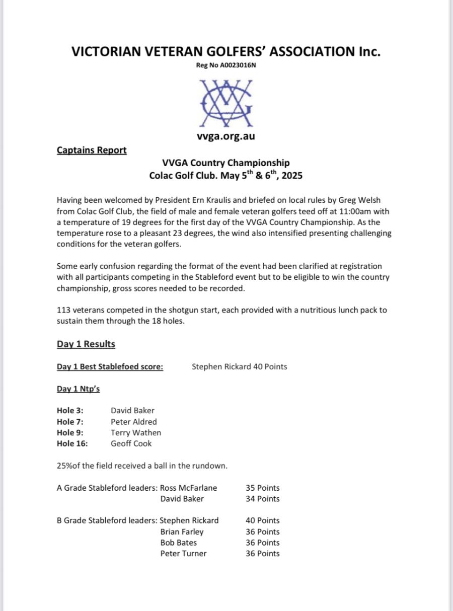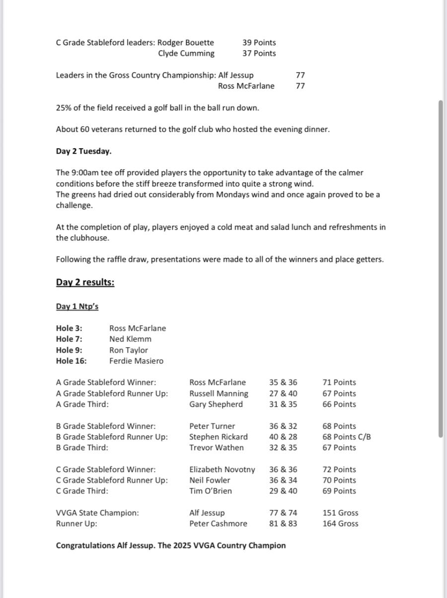 Attached are the Results of the Victorian Veteran Golfers Country Championships held at Colac Golf Course 5th & 6th May 2025